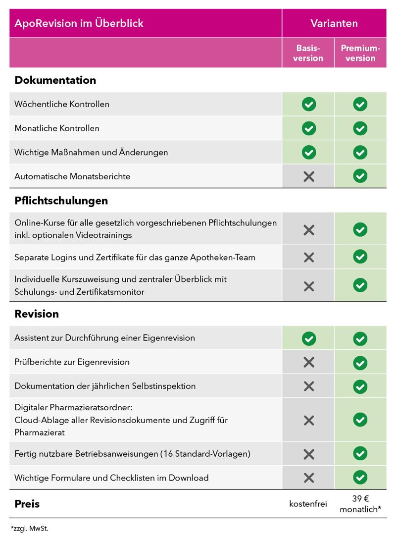 Die webbasierte und für Smartphones optimierte Software ApoRevision besteht aus den drei Modulen: Dokumentation, Revision und Pflichtschulungen. Jedes dritte Apothekenteam in Deutschland nutzt bereits ApoRevision für die gesetzlich vorgeschriebenen Pflichtschulungen, Revision und zur Dokumentation der Qualitätssicherung.