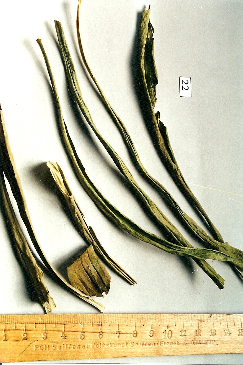 - An den blau-purpurn überhauchten Stängeln trägt sie länglich lanzettliche Blätter
