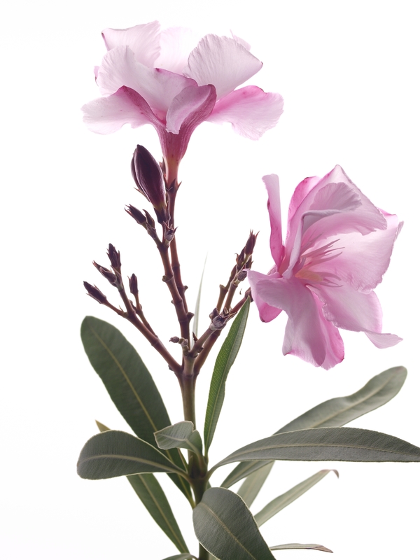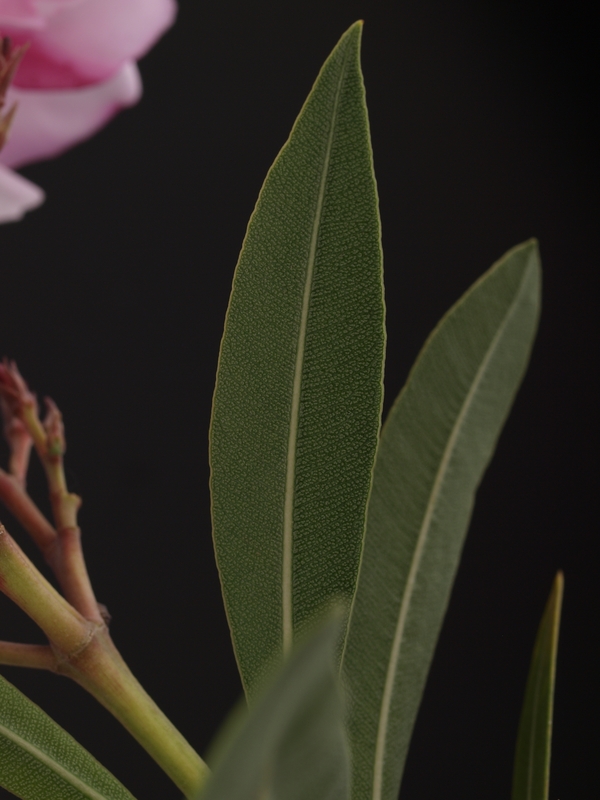 • Lanzettförmige, ledrige, etwa 6 bis 10 cm lange dunkelgrüne Blätter, die normalerweise zu dritt, quirlförmig angeordnet, am Ast stehen