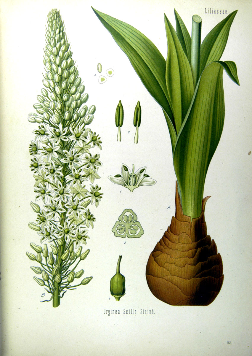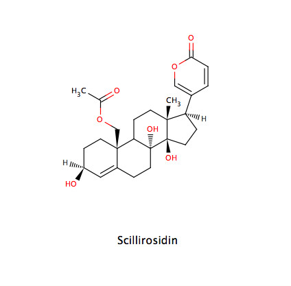 • Rote Varietät → Hauptglykosid Scillirosid (Aglykon: Scillirosidin)
