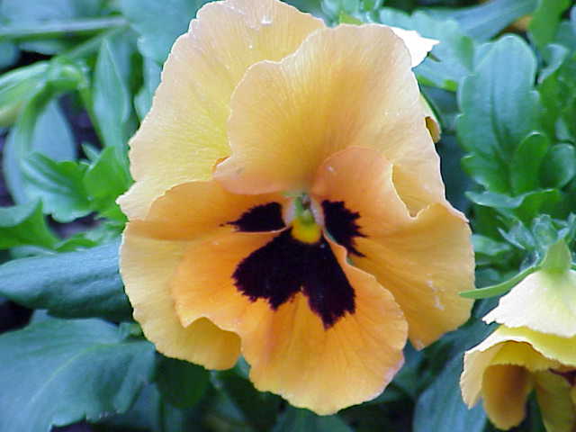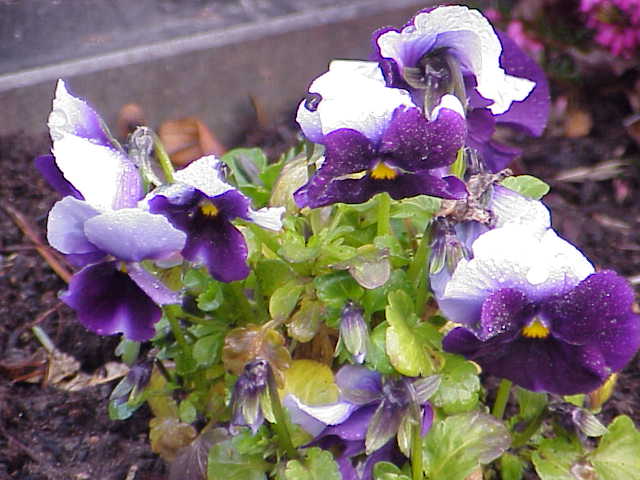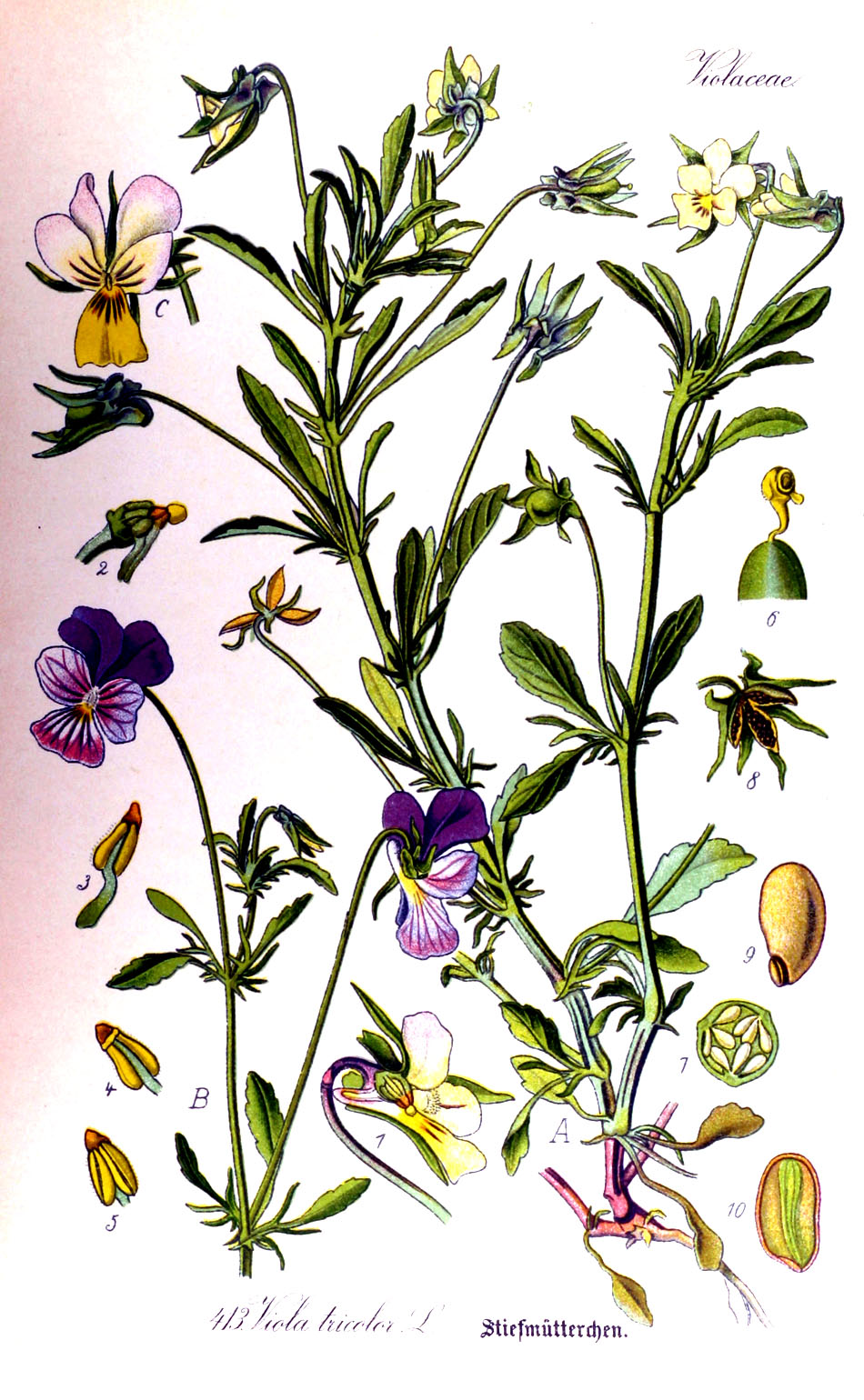 • Wildes Stiefmütterchen mit gewöhnlich zwei oberen Kronblättern(blauviolett); unteres Kronblatt gelb und  beide seitlichen weiß oder auch blauviolett - blüht also dreifarbig (tricolor)