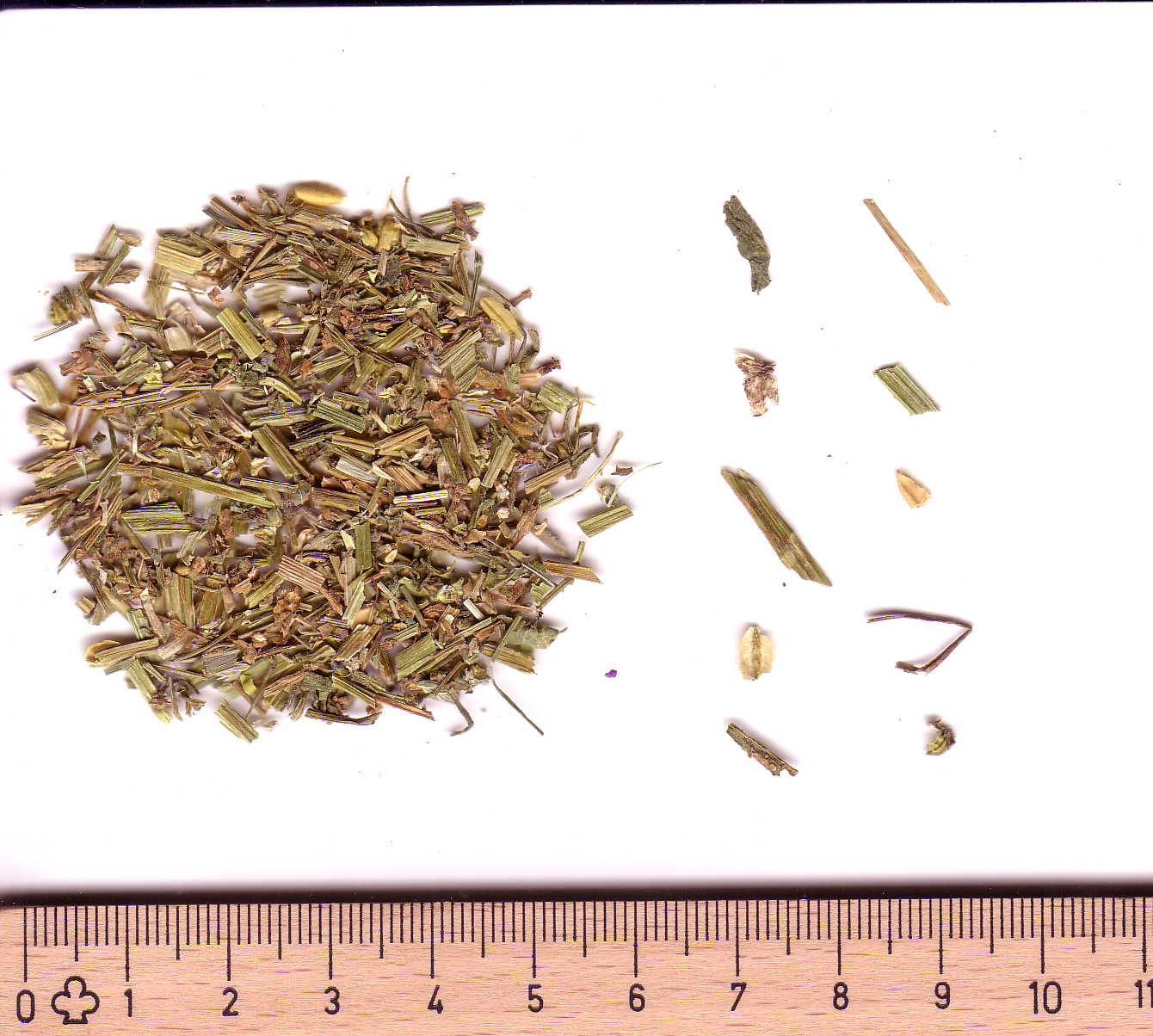 Allgemein: Blaue sowie intensiv gelbe und / oder hellviolett bis nahezu weiße, vielfach eingerollte Bruchstücke der Blüte; Ddreiklappig aufspringende Fruchtkapseln von gelblich-brauner Farbe mit kleinen birnenförmigen Samen; dünne, hohle leicht kantige Stängelbruchstücke; helle, stark geschrumpfte Blattfragmente